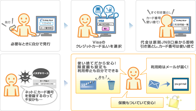 ワンタイムデビット最大のメリットはそのセキュリティ性です。インターネットでの取引を行う場合にはクレジットカード番号(デビットカード番号)を登録する必要がありますが、このカード番号が不正な手段で利用されるという心配があります。